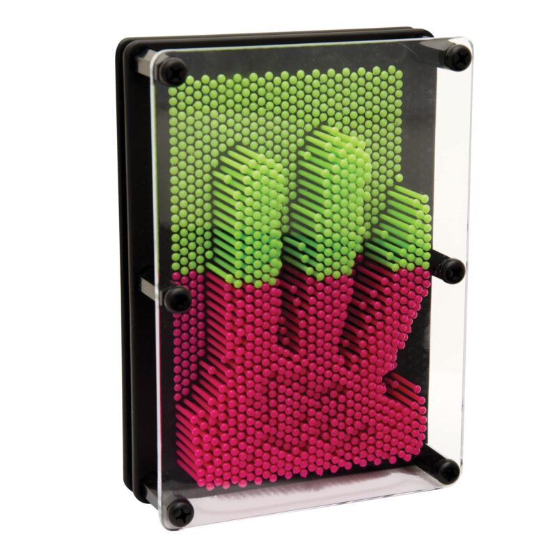 The Schylling Large Pin Print is a classic desk toy that transforms everyday objects into 3D impressions using hundreds of smooth metal pins. Press your hand, a toy, or anything with texture — then tilt and watch your creation pop! 🧲🌟